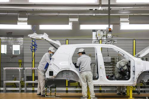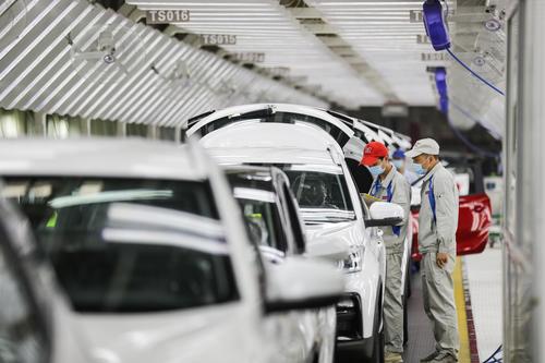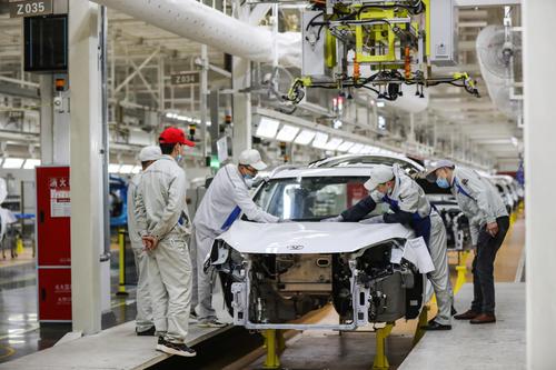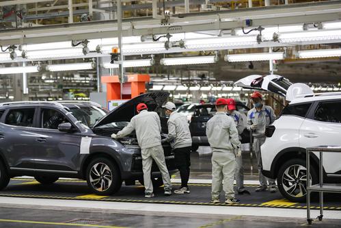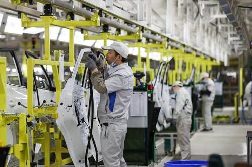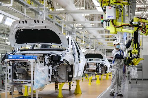 图片说明:2021年3月18日,在四川省宜宾三江新区宜宾凯翼汽车有限公司总装车间,工人在智慧生产线上忙碌。