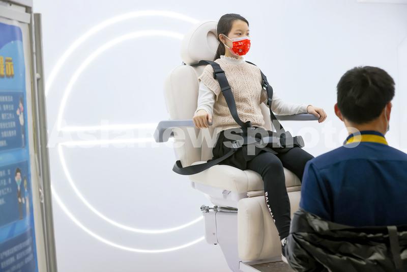 图片说明:3月20日,在中国科技馆内举行的“中国载人航天互动科普展”上,小朋友在体验旋转座椅。