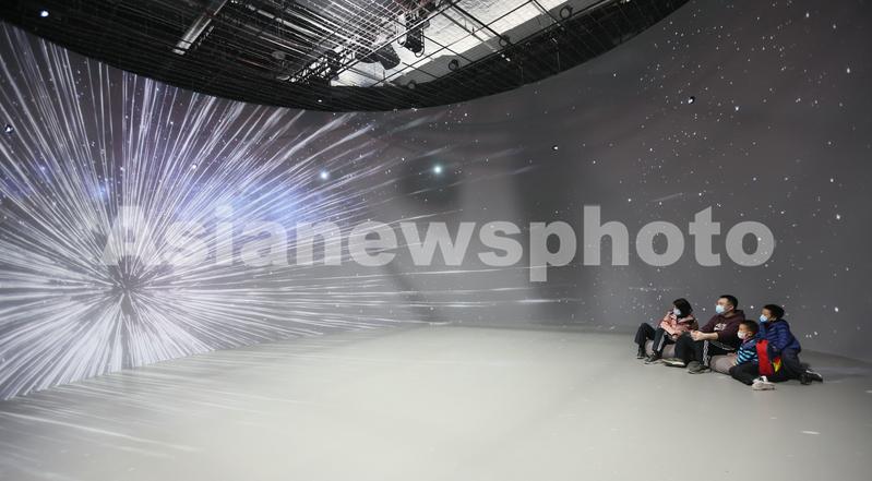 图片说明:3月20日,在中国科技馆内举行的“中国载人航天互动科普展”上,家长和孩子在裸眼3D环形沉浸式空间“宇宙微尘剧场”内“观看身临其境的太空”。