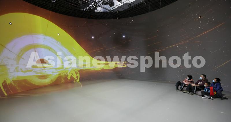 图片说明:3月20日,在中国科技馆内举行的“中国载人航天互动科普展”上,家长和孩子在裸眼3D环形沉浸式空间“宇宙微尘剧场”内“观看身临其境的太空”。