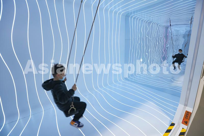 图片说明:3月20日,在中国科技馆内举行的“中国载人航天互动科普展”上,小朋友在体验锻炼宇航员前庭功能的秋千训练场景。