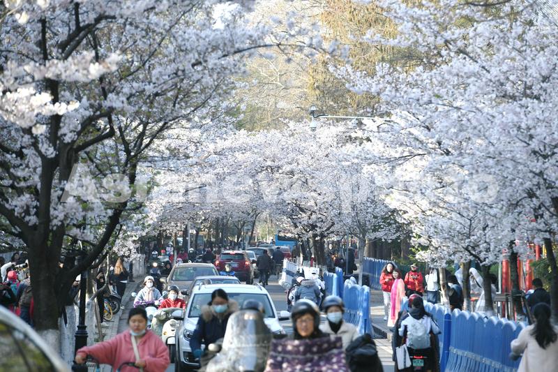 图片说明:2021年3月23日,市民在南京鸡鸣寺路上樱花大道上出行。