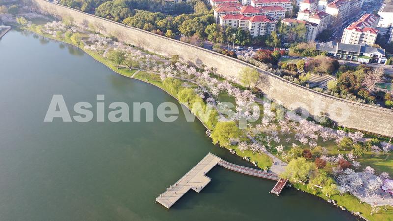 图片说明:2021年3月23日,在南京玄武湖公园解放门附近明城墙下拍摄的樱花。