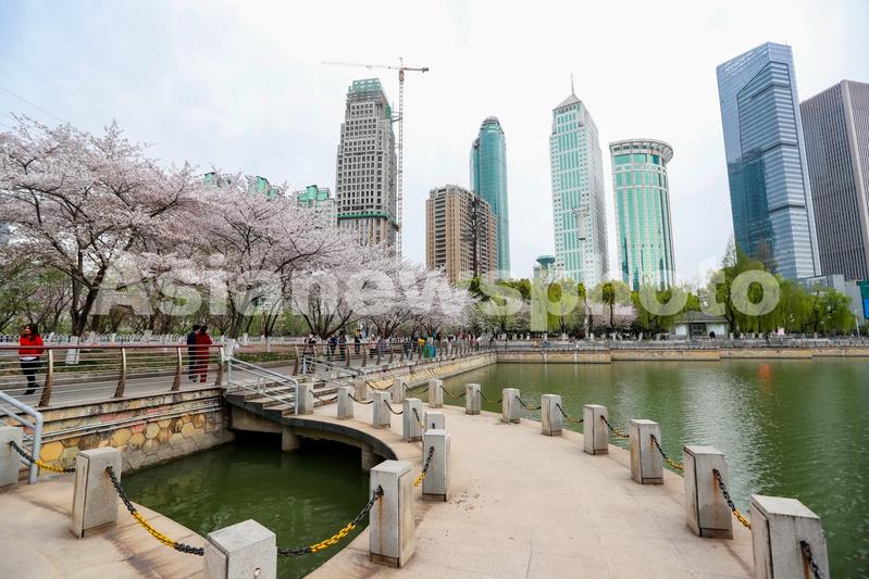 图片说明:3月23日,武汉汉口西北湖樱花林盛开,樱花林下游人如织。