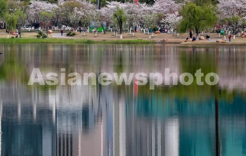 图片说明:3月23日,武汉汉口西北湖樱花林盛开,樱花林下游人如织。
