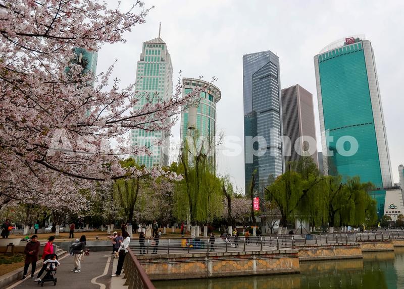 图片说明:3月23日,武汉汉口西北湖樱花林盛开,樱花林下游人如织。