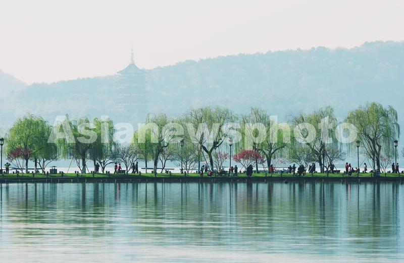 图片说明:2021年3月24日, 游客在杭州西湖白堤观赏春日美景。