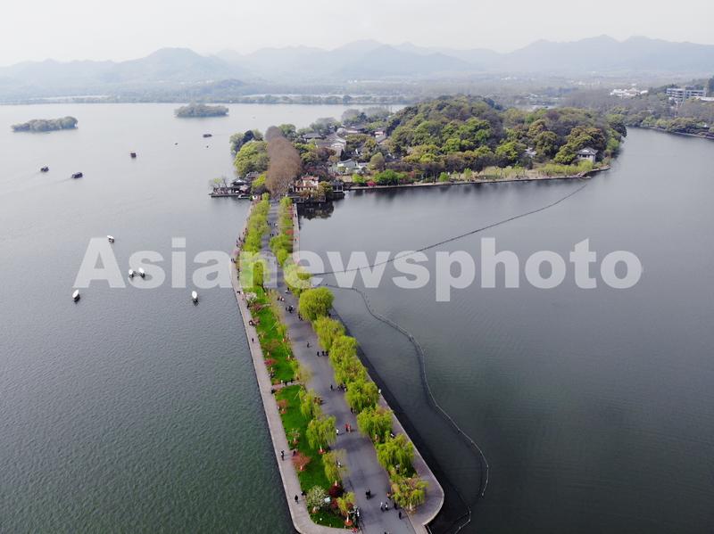 图片说明:2021年3月24日,航拍春日中的杭州西湖白堤。