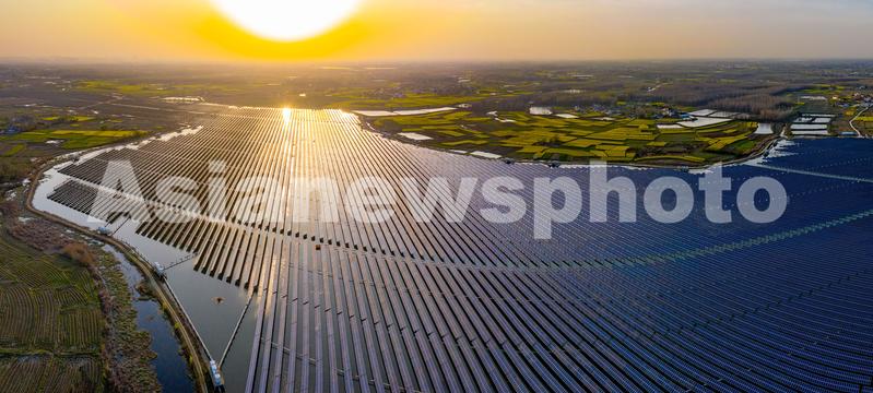 图片说明:2021年3月25日,安徽省合肥市肥东县梁园镇陷陂湖水库周边油菜花盛开,与水库上的渔光互补光伏电站互相映衬景色优美。