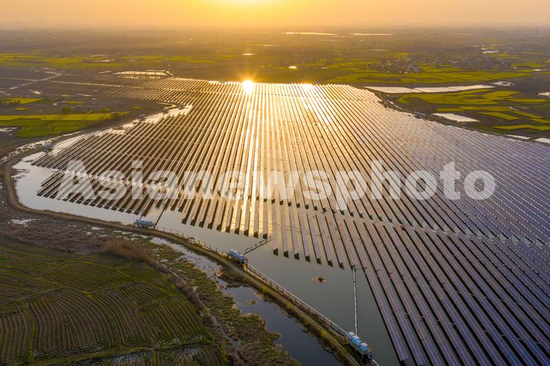 图片说明:2021年3月25日,安徽省合肥市肥东县梁园镇陷陂湖水库周边油菜花盛开,与水库上的渔光互补光伏电站互相映衬景色优美。