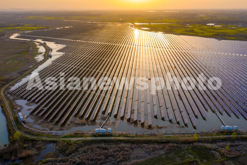 图片说明:2021年3月25日,安徽省合肥市肥东县梁园镇陷陂湖水库周边油菜花盛开,与水库上的渔光互补光伏电站互相映衬景色优美。