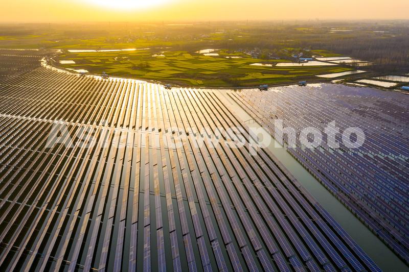 图片说明:2021年3月25日,安徽省合肥市肥东县梁园镇陷陂湖水库周边油菜花盛开,与水库上的渔光互补光伏电站互相映衬景色优美。