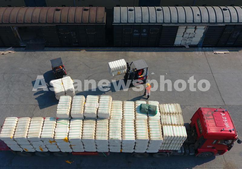 3月26日,在江西九江南火车站,工作人员对来自新疆阿克苏的皮棉进行卸车。
