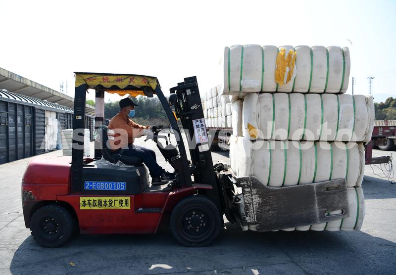 3月26日,在江西九江南火车站,工作人员对来自新疆阿克苏的皮棉进行卸车。