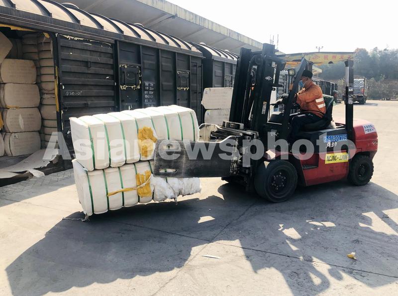 3月26日,在江西九江南火车站,工作人员对来自新疆阿克苏的皮棉进行卸车。