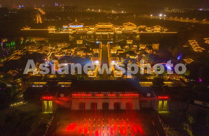 2021年3月31日,湖北省襄阳市,游客在襄阳唐城景区观赏夜景。