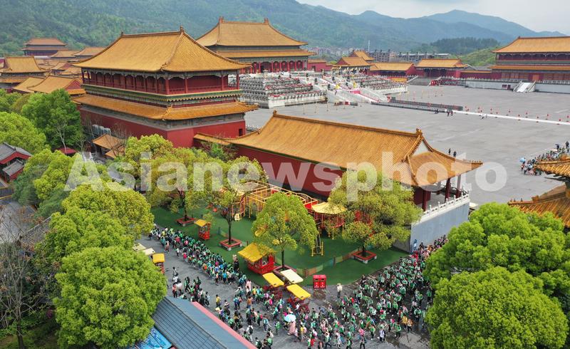 图片说明:4月1日,学生在浙江省东阳市横店影视城明清宫苑景区内春游研学。