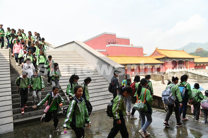 图片说明:4月1日,学生在浙江省东阳市横店影视城明清宫苑景区内春游研学。