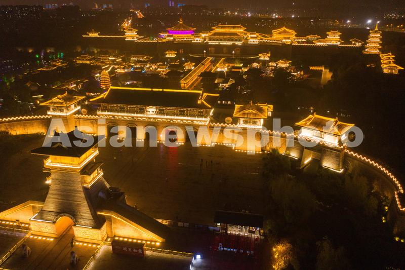 2021年3月31日,湖北省襄阳市,襄阳唐城景区夜景。