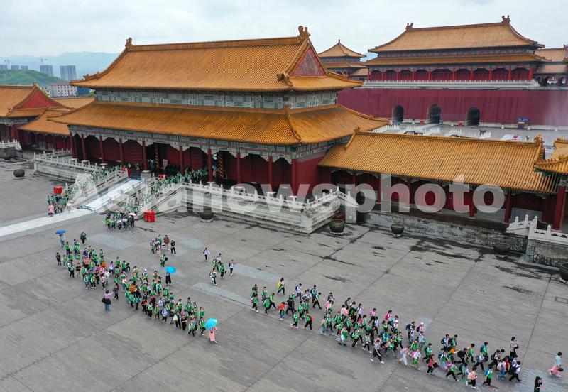 图片说明:4月1日,学生在浙江省东阳市横店影视城明清宫苑景区内春游研学。