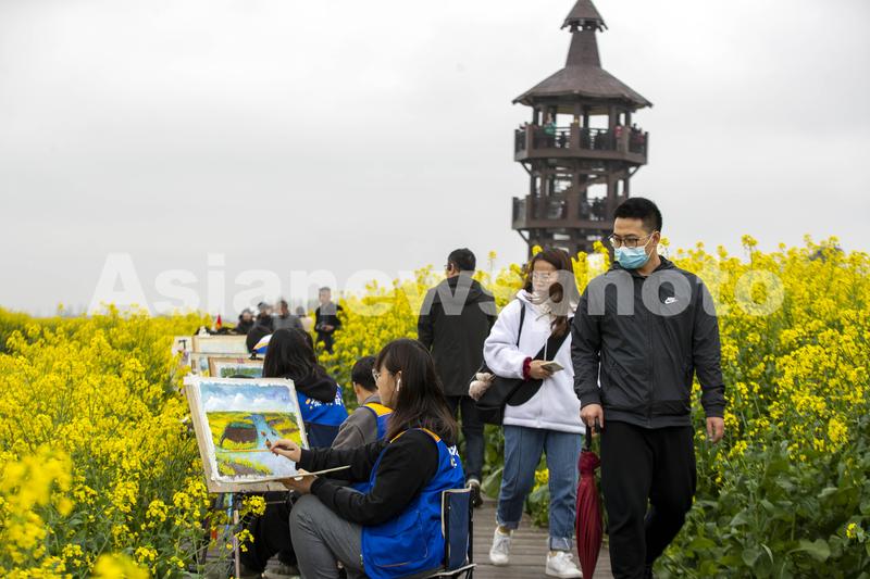 图片说明:2021年4月3日,泰州学院美术专业学生在江苏泰州兴化市千垛景区用画笔描绘千垛菜花美景。