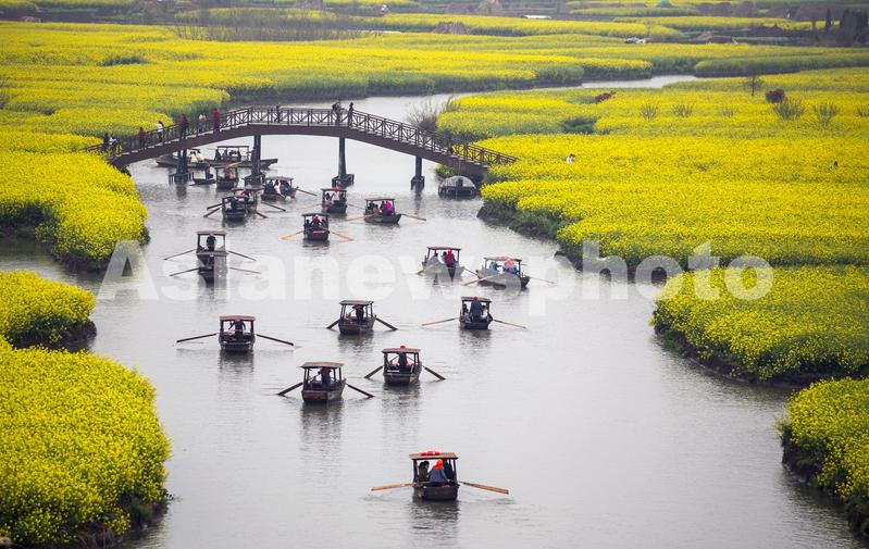 图片说明:2021年4月3日,游客在江苏泰州兴化市千垛景区乘船观看油菜花。
