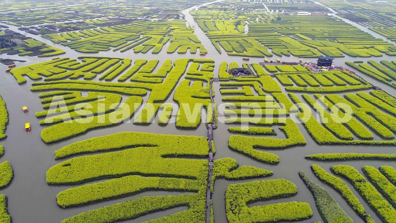 图片说明:2021年4月3日,游客在江苏泰州兴化市千垛景区乘电动船观看油菜花(无人机照片)。