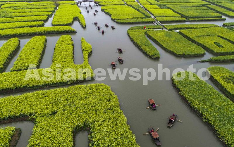 图片说明:2021年4月3日,游客在江苏泰州兴化市千垛景区乘船观看油菜花(无人机照片)。