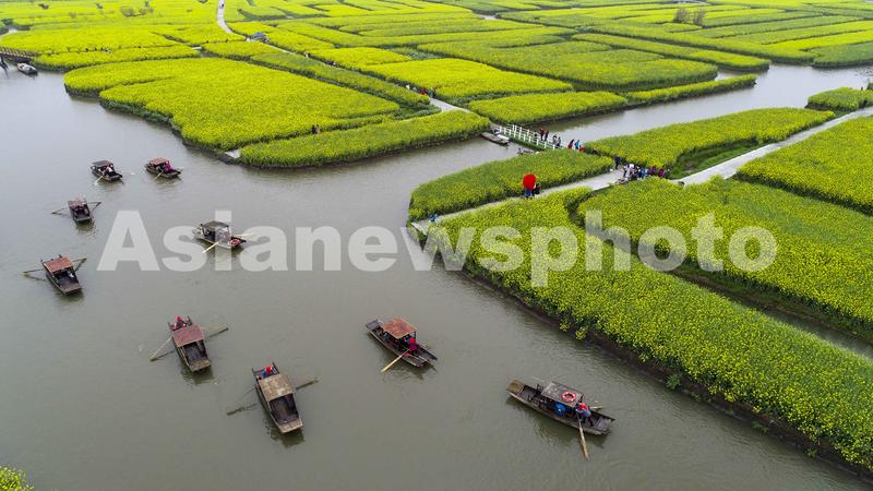 图片说明:2021年4月3日,游客在江苏泰州兴化市千垛景区乘船观看油菜花(无人机照片)。
