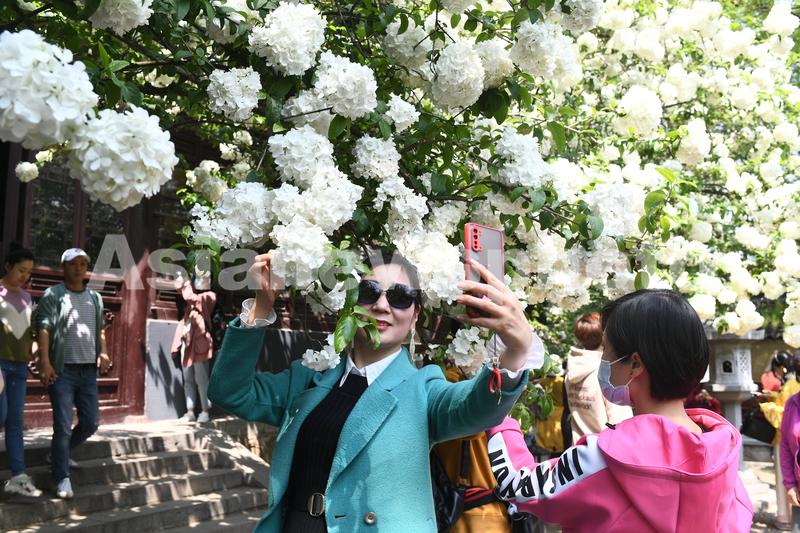 图片说明:2021年4月6日,江苏南京,市民在清凉山公园崇正书院观赏拍摄绣球花。