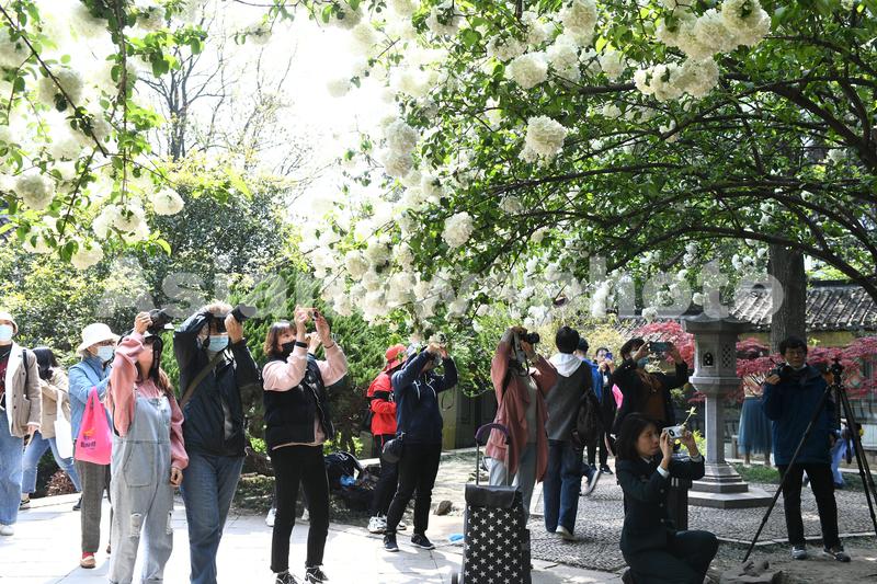 图片说明:2021年4月6日,江苏南京,市民在清凉山公园崇正书院观赏拍摄绣球花。