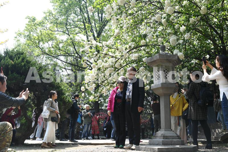 图片说明:2021年4月6日,江苏南京,市民在清凉山公园崇正书院观赏拍摄绣球花。