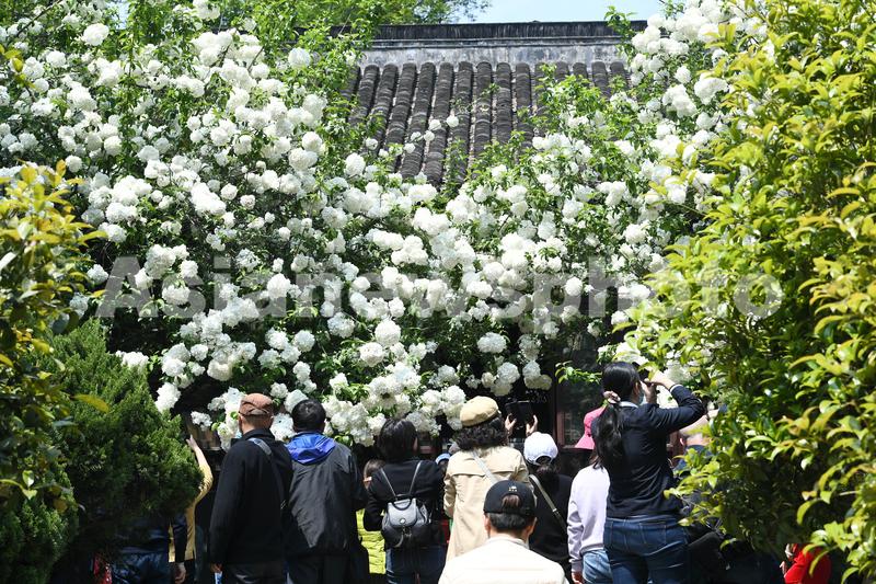 图片说明:2021年4月6日,江苏南京,市民在清凉山公园崇正书院观赏拍摄绣球花。