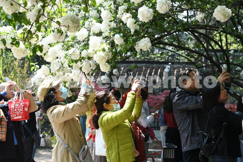 图片说明:2021年4月6日,江苏南京,市民在清凉山公园崇正书院观赏拍摄绣球花。