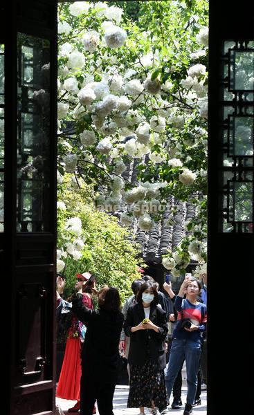 图片说明:2021年4月6日,江苏南京,市民在清凉山公园崇正书院观赏拍摄绣球花。