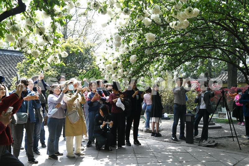 图片说明:2021年4月6日,江苏南京,市民在清凉山公园崇正书院观赏拍摄绣球花。