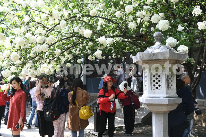 图片说明:2021年4月6日,江苏南京,市民在清凉山公园崇正书院观赏拍摄绣球花。