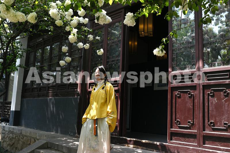 图片说明:2021年4月6日,江苏南京,市民在清凉山公园崇正书院观赏拍摄绣球花。