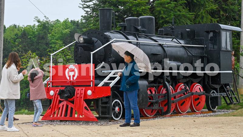 2021年4月11日,江西省上饶市婺源县太白镇新村,游客在“火车风情小镇”上参观。