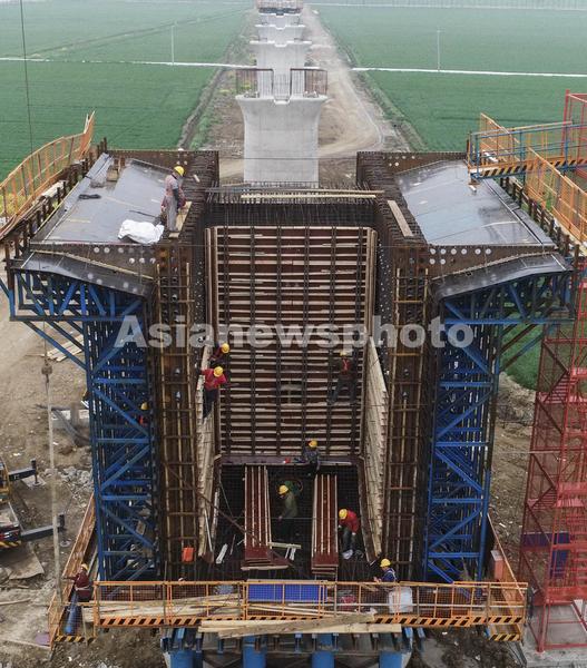 图片说明:2021年4月12日,江苏淮安,工人在铁路桥墩施工作业。