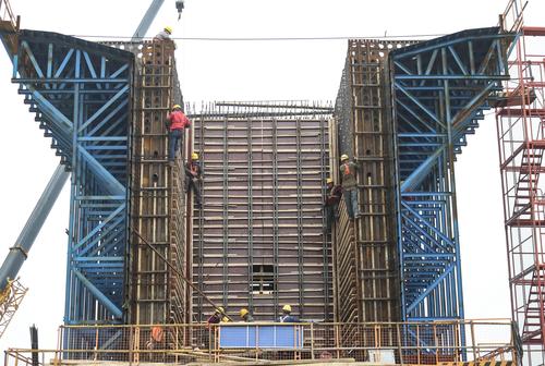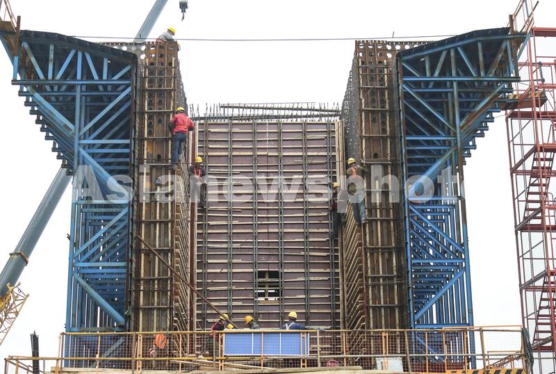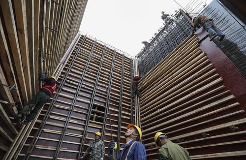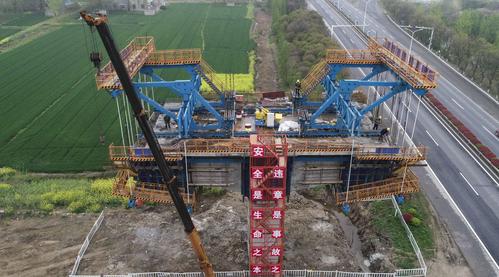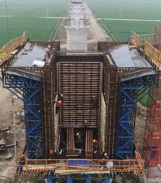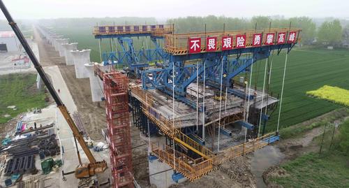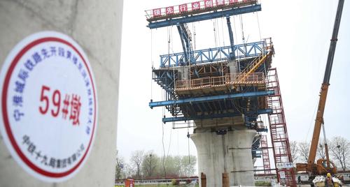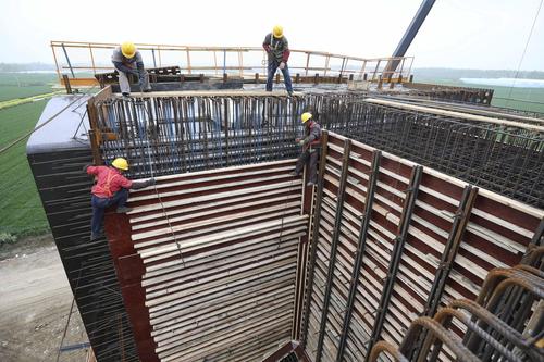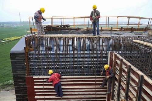图片说明:2021年4月12日,江苏淮安,工人在铁路桥墩施工作业。