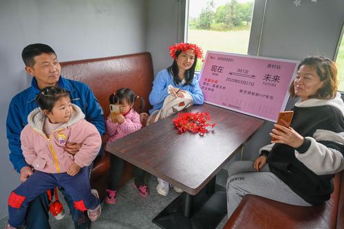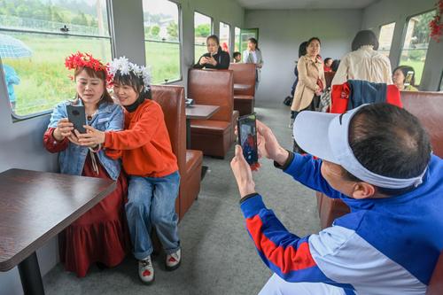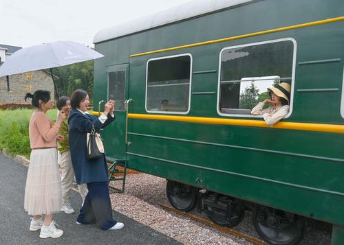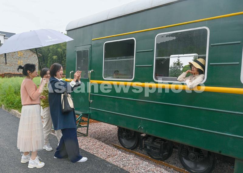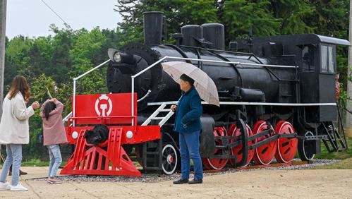 2021年4月11日,江西省上饶市婺源县太白镇新村“火车风情小镇”,游客体验绿皮火车并拍照留影。
