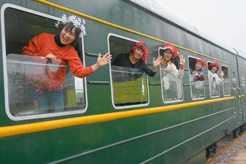 2021年4月11日,江西省上饶市婺源县太白镇新村,一辆老式火车上,来自周边的游客在拍照,体验回忆绿皮火车时代的气息。