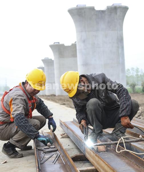 图片说明:2021年4月12日,江苏淮安,工人在铁路桥墩施工作业。