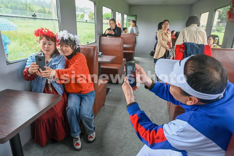 2021年4月11日,江西省上饶市婺源县太白镇新村,一辆老式火车上,来自周边的游客在拍照,体验回忆绿皮火车时代的气息。