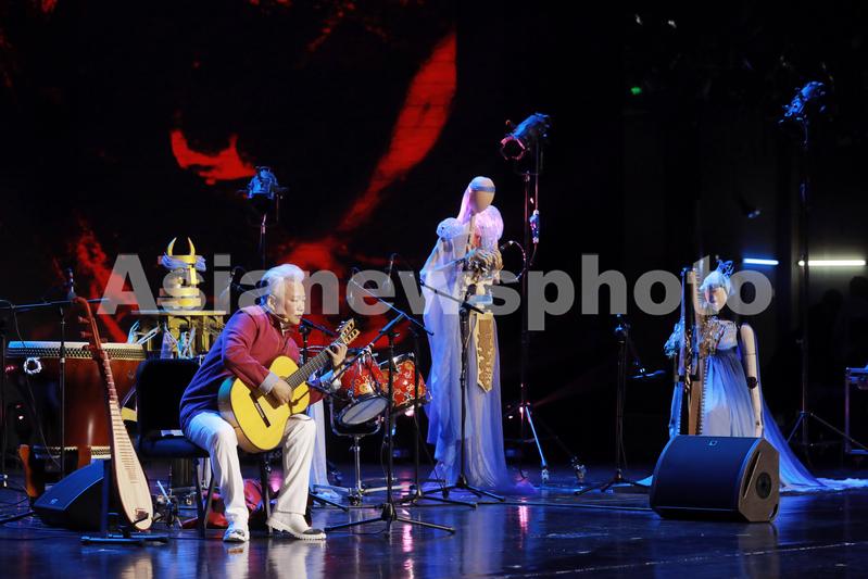 图片说明:2021年4月10日晚,北京,清华大学新清华学堂舞台上,3位与人类身高相仿的机器人“乐手”与民族音乐演奏家方锦龙同台奏乐,带来“中国风”机器人乐队与人类艺术家的合作表演。