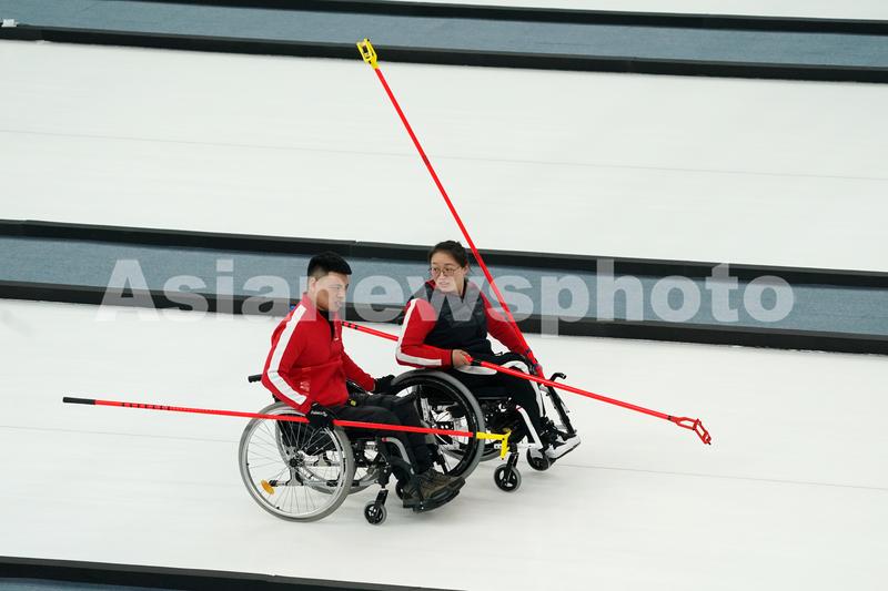 图片说明:2021年4月9日,运动员在“相约北京”轮椅冰壶测试活动中。