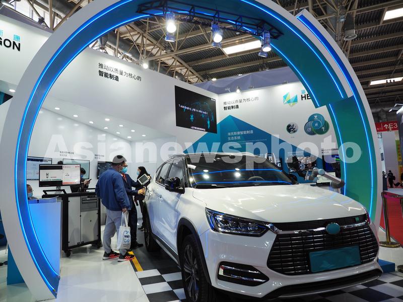 2021年4月13日,在北京中国国际展览中心(新馆)举办的第十七届中国国际机床展览会上,观众在参观展会。