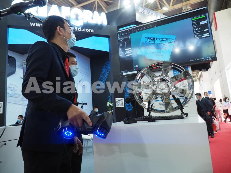 2021年4月13日,在北京中国国际展览中心(新馆)举办的第十七届中国国际机床展览会上,厂商工作人员为观众演示便携式3D扫描仪。
