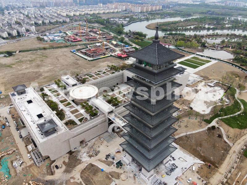 2021年4月14日拍摄的扬州中国大运河博物馆。经过一年多的建设,位于江苏扬州运河三湾风景区内的扬州中国大运河博物完成主体建筑外墙装饰建设,进入内部装修的施工冲刺阶段。